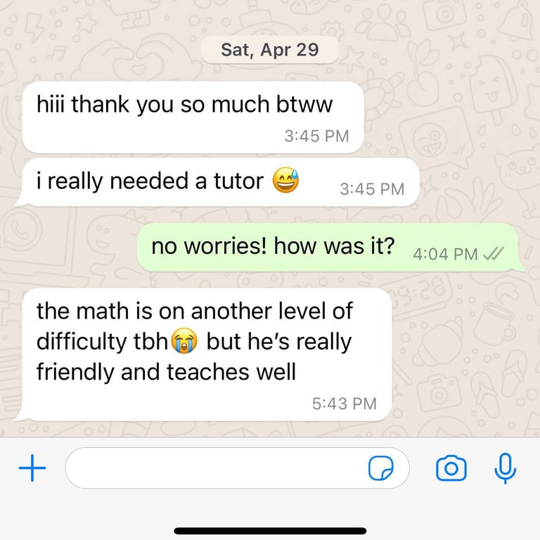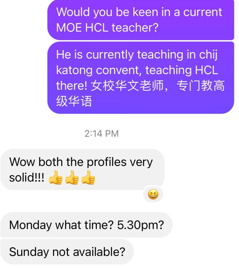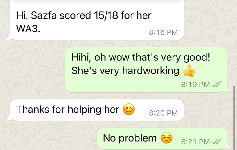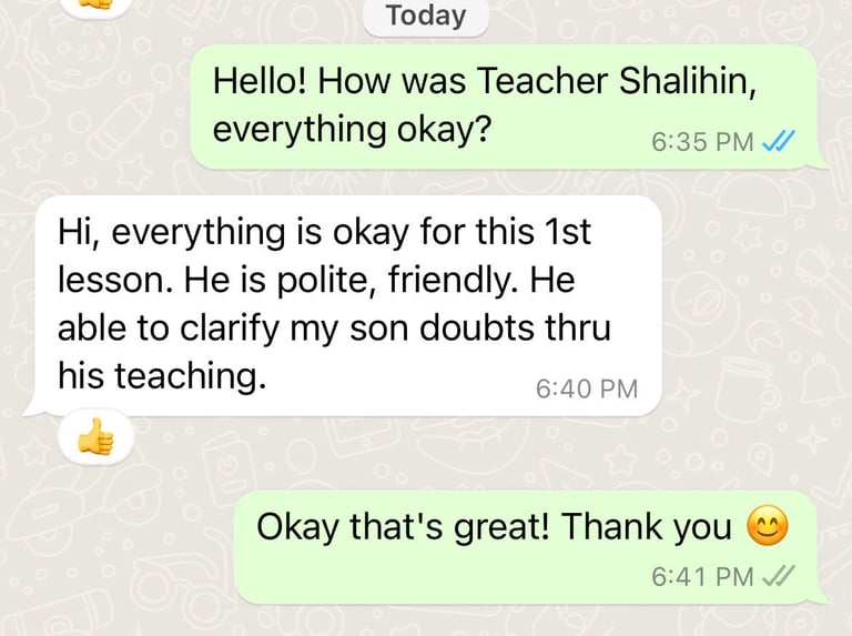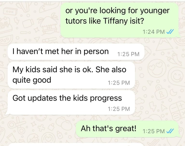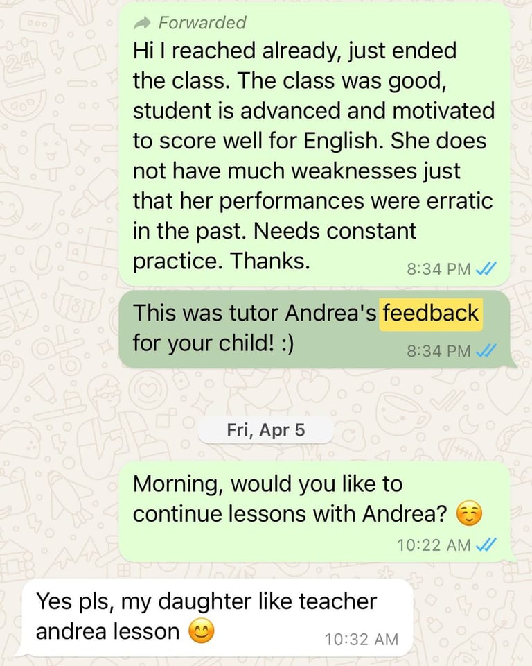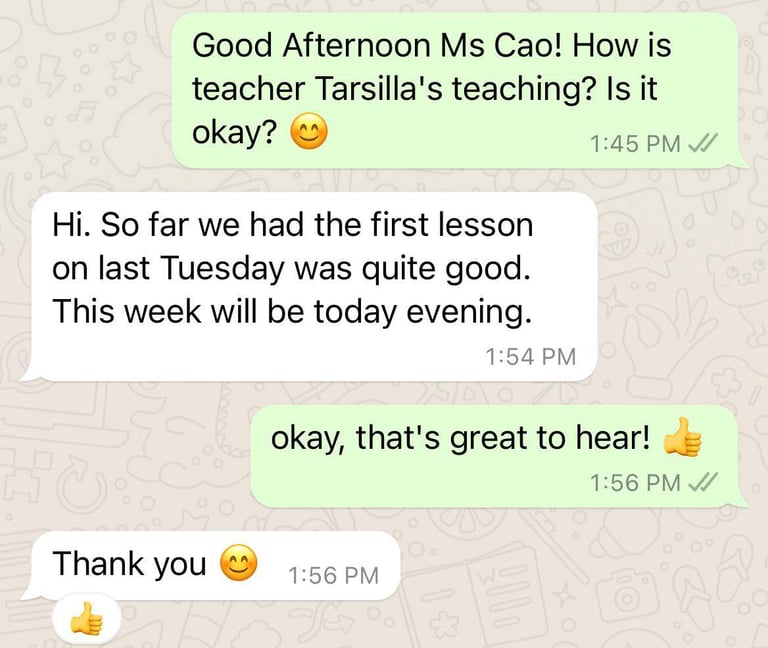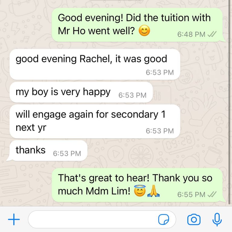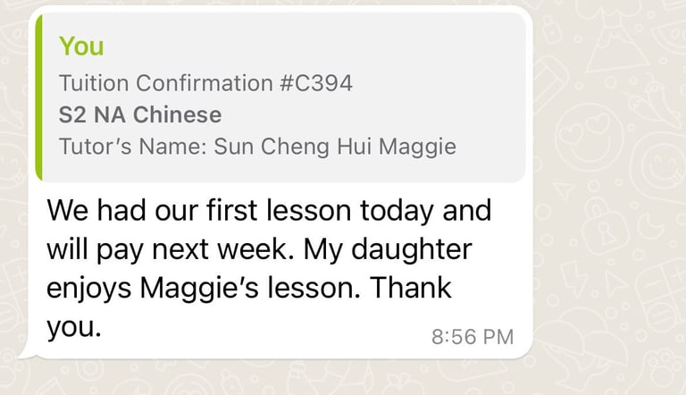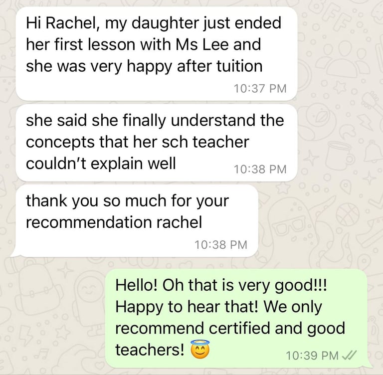 Read what parents are saying about their experiences with Tutor Trust SG! We value feedback from our clients and are proud to share their testimonials highlighting the positive impact our tutoring services have had on their children's academic journeys. Discover how Tutor Trust SG has made a difference in the lives of students and families across Singapore.